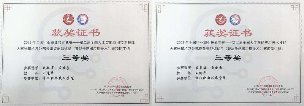 近日,我校智能制造学院收到“2022年全国行业职业技能竞赛——第二届全国人工智能应用技术技能大赛决赛”获奖证书。由教师熊超有、左培良组成的四川省职工代表队和学生李民海、鲁凯豪组成的四川省学生代表队分别荣获计算机及外部设备装配调试员(智能传感器应用技术)赛项三等奖。
