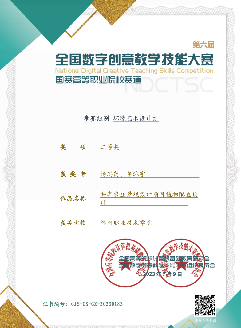 在第六届全国数字创意教学技能大赛高职学校赛道比赛中,我校艺术设计学院牟泳宇、杨琪芮两位教师的参赛作品《共享农庄景观设计功能分区的表达方式》《共享农庄景观设计项目植物配置设计》分别斩获全国一、二等奖。