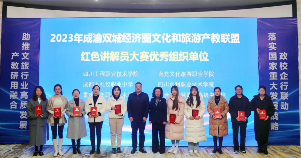 会上,参会领导为在“2023年成渝地区双城经济圈文化和旅游产教联盟红色讲解员大赛”中荣获“十佳红色讲解员”称号的同学和获得联盟行业组“十佳红色讲解员”的行业代表以及本次大赛的“优秀组织单位”颁奖。