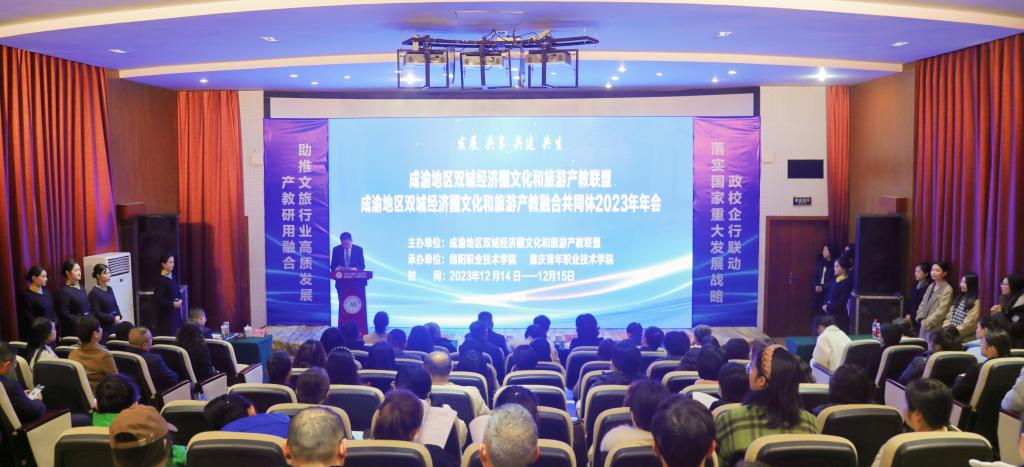 12月15日,成渝地区双城经济圈文化和旅游产教联盟2023年年会在我校召开。绵阳市教育和体育局一级调研员周时光,绵阳市文化广播电视和旅游局党组成员、总规划师邓世红,共青团绵阳市委副书记王乾熙,绵阳市妇女联合会副主席汪晓燕,重庆青年职业技术学院党委书记朱毓高,绵阳职业技术学院党委书记袁蓉等出席年会,联盟成员单位四川工程职业技术学院等40所学校和20家企业代表参会。我校党委常委、副院长杨建国主持会议。