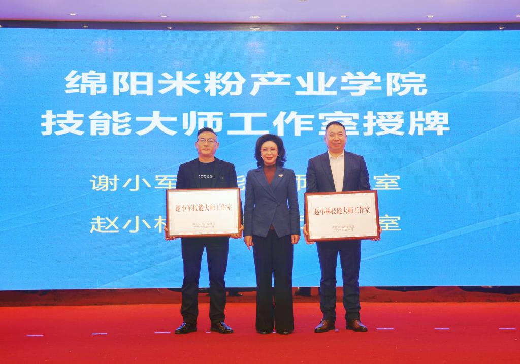 会上,袁蓉为谢小军技能大师工作室和赵小林技能大师工作室授牌,王荣海致欢迎辞并为绵阳米粉产业学院客座教授颁发聘书。