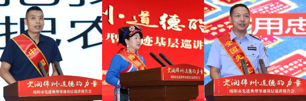 本次巡讲邀请了四川省道德模范、四川好人、北川县伊珎羌绣有限公司总经理陈云珍,四川省道德模范、四川好人、绵阳市公安局刑侦支队一大队教导员胡祥雨和中国好人、四川好人、平武县猫熊谷家庭农场总经理张玉波作先进事迹报告。三位模范代表分别围绕工作经历,用质朴的语言、鲜活的事迹和真挚的感情进行讲述,彰显了平凡人的社会责任与担当,以行动践行了中华民族敬业奉献、助人为乐、诚实守信的传统美德,为听众带来一场生动的精神盛宴。现场气氛热烈,大家被模范的先进事迹所感染,不时爆发出阵阵掌声。