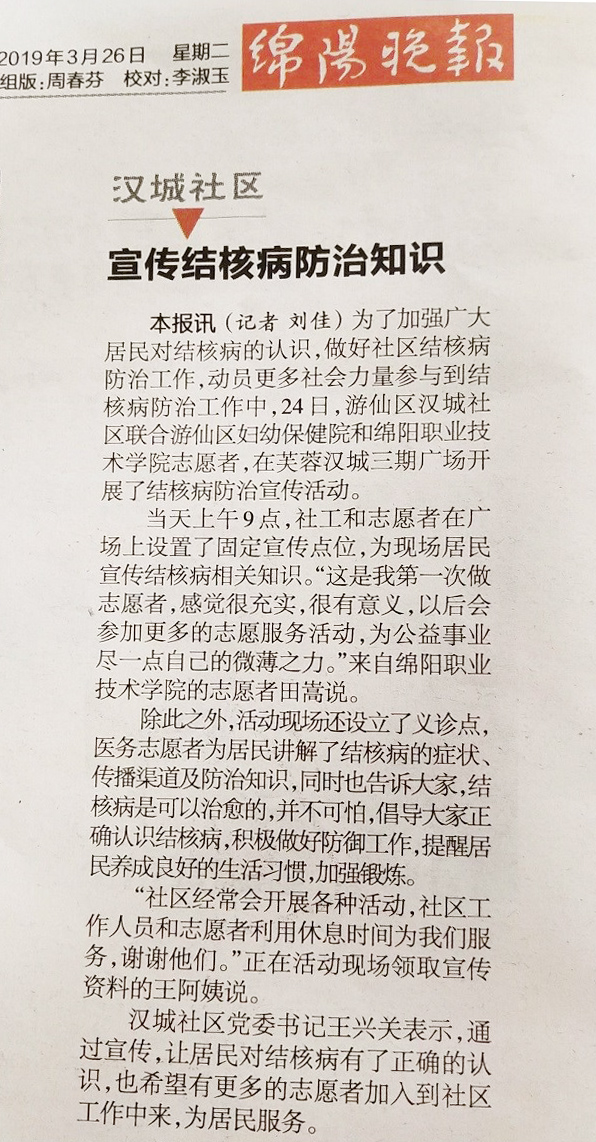 为提高市民对结核病的预防治疗知识,遏制结核病流行,切实开展好、落实好“青年志愿·爱在社区”大学生志愿服务进社区活动,3月24日上午,汉城社区联合学校计算机科学系团总支与游仙区妇幼保健院在芙蓉汉城小区法治广场举办主题为“开展终结结核行动,共建共享健康中国”的结核病日大型宣传活动。活动得到了绵阳晚报专题报道。