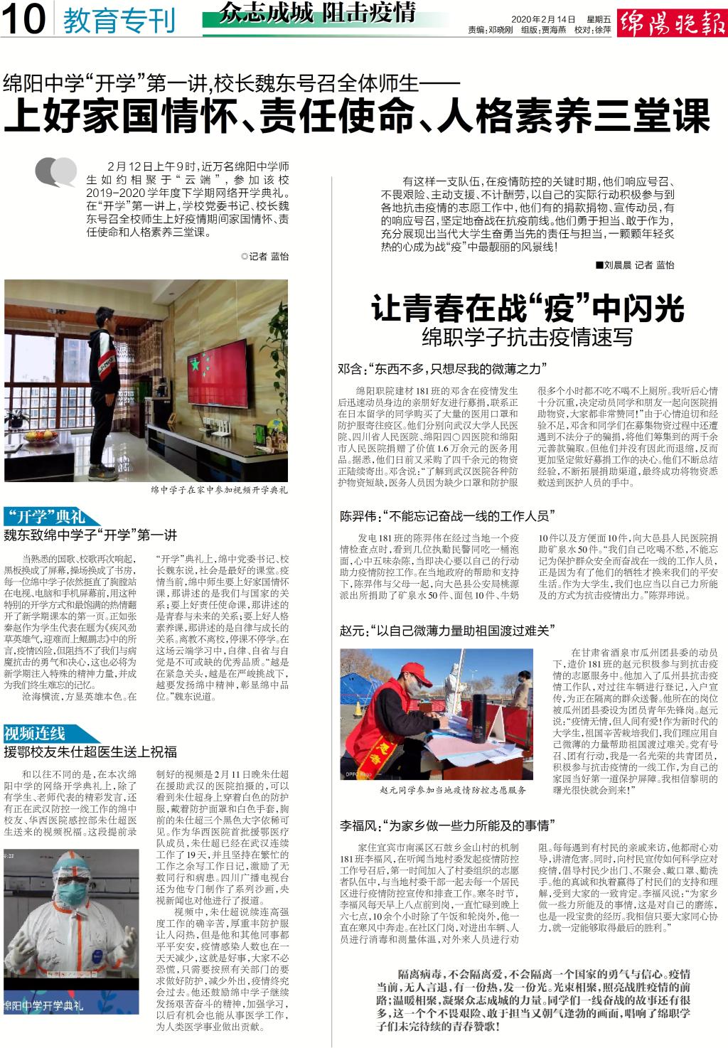 今日头条、四川教育信息网:让青春在战“疫”中闪光 绵职学子抗击疫情速写