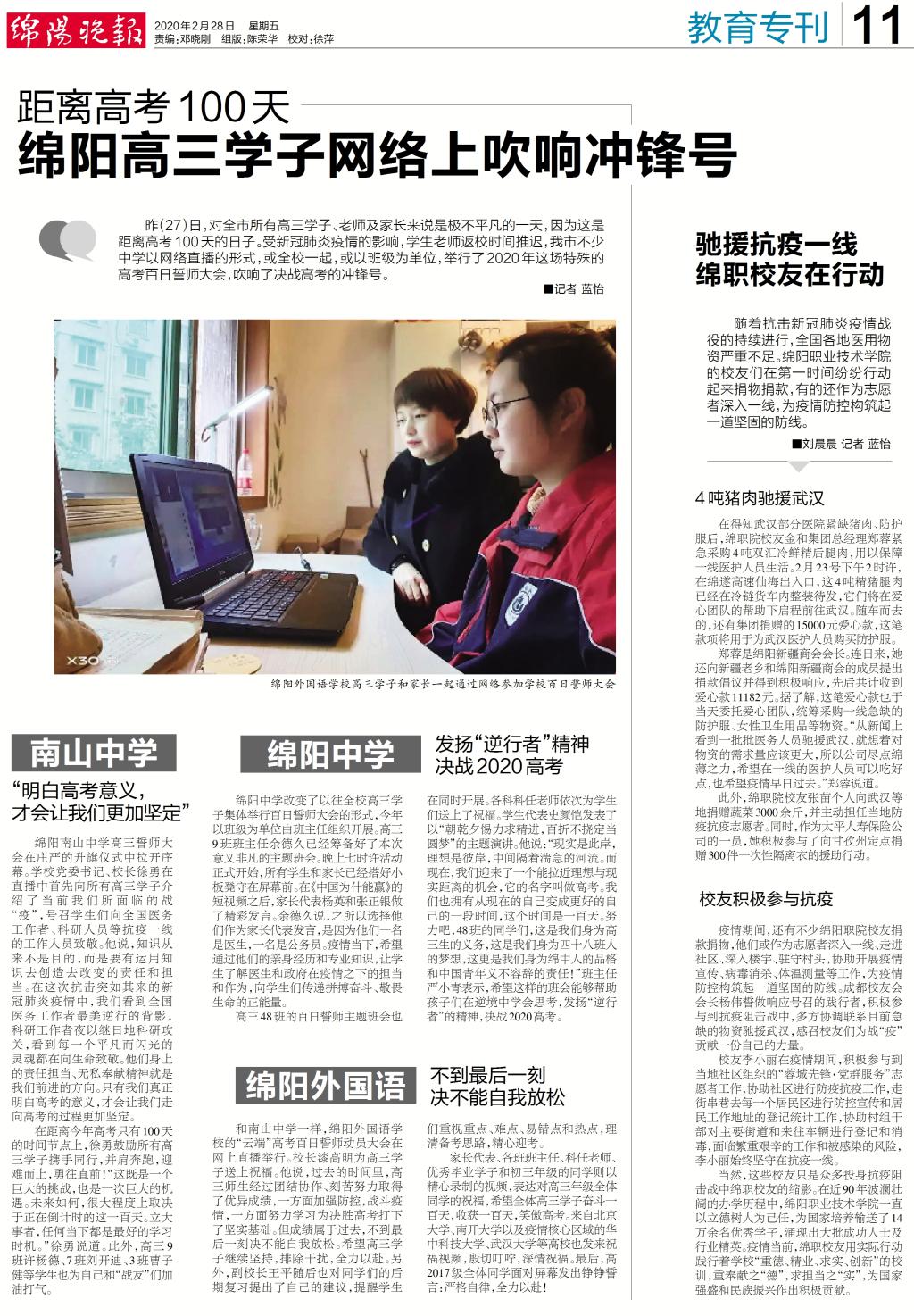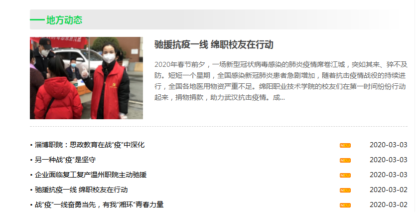 2020年春节前夕,一场新型冠状病毒感染的肺炎疫情席卷江城,突如其来、猝不及防。短短一个星期,全国感染新冠肺炎患者急剧增加,随着抗击疫情战役的持续进行,全国各地医用物资严重不足。绵阳职业技术学院的校友们在第一时间纷纷行动起来,捐物捐款,助力武汉抗击疫情。今日头条、凤凰新闻网、四川教育信息网、四川职教网、绵阳晚报等媒体纷纷报道我校校友抗“疫”事迹,中国高职高专教育网还作为地方动态的头条新闻进行了报道。