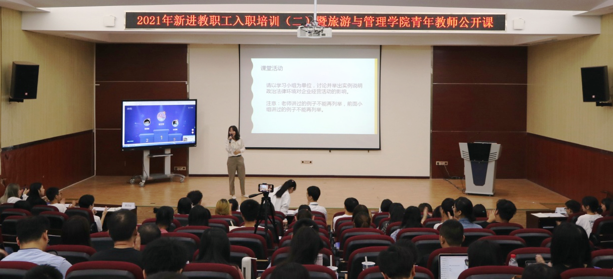 本阶段培训由观摩青年教师公开课、党史教育专题讲座两堂课组成。公开课上,旅游与管理学院教师黄笑雨充分利用信息化教学手段,以不同形式和学生互动,为新进教职工提供了一个典型教学范例。马克思主义学院院长曹武军为新进教职工做了一堂生动精彩的党史教育专题讲座。在讲座中,曹武军带领大家回顾了中国共产党早期的革命活动,深入浅出地向大家讲授了那段波澜壮阔的历史,希望大家在今后的教学活动中活学活用,将党史学习教育与入职培训融会贯通。