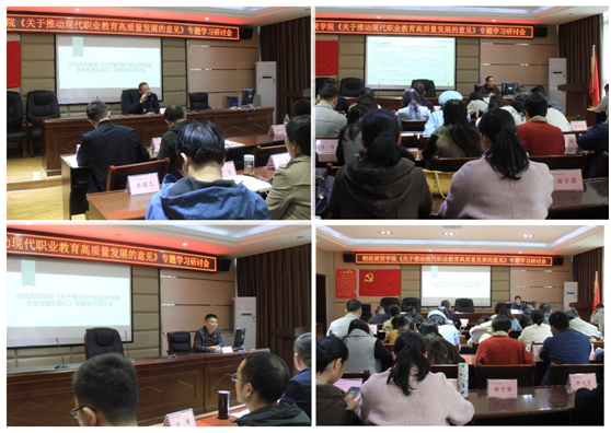 会上,苏自强强调,《意见》不仅立足当前,更谋划长远,是国家推动现代职业教育发展的“操作手册”,为广大职业院校教师指明了职业教育改革发展的方向和路径。他希望老师们要认真学习贯彻好《意见》精神,以问题为导向,不断深化教育教学改革,创新教学模式与方法,为建设技能型社会与推动学院更快更好发展做出努力。
