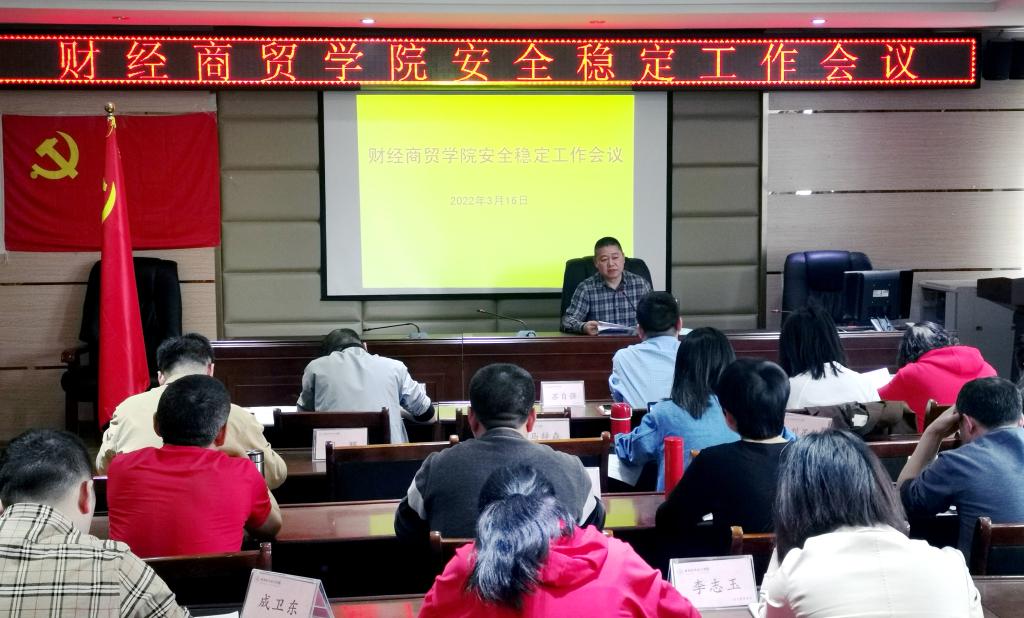 3月16日,财经商贸学院召开安全稳定工作会议,学院全体教职工参会。会议由学院党总支书记苏自强主持。