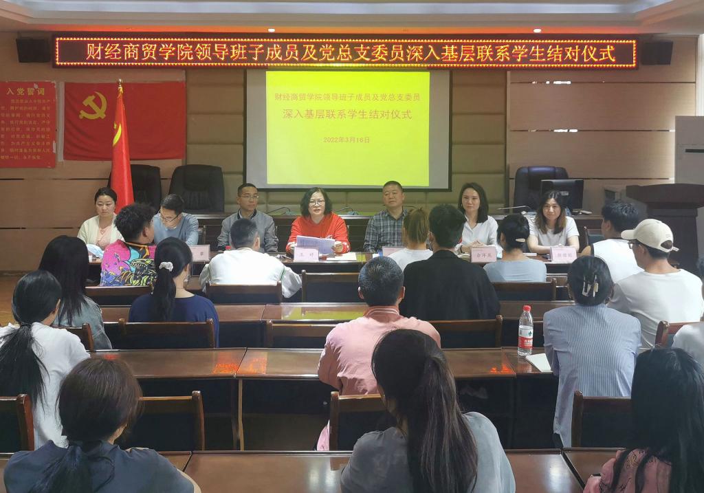 3月16日下午,财经商贸学院召开领导班子成员及党总支委员深入基层联系学生结对仪式。党总支书记苏自强、院长王婷、副院长李攀、党总支副书记佘洋燕、综合办主任李富以及党总支委员李德久、颜耀懿、尹诗参加仪式。