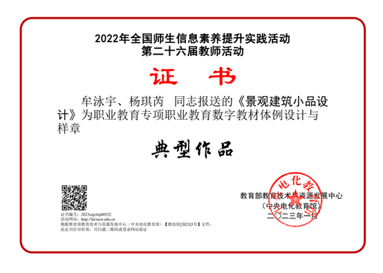 近期,教育部教育技术与资源发展中心(中央电化教育馆)发布关于总结2022年全国师生信息素养提升实践活动(第二十六届教师活动)参与情况的通知,我校艺术设计学院教师牟泳宇、杨琪芮提交的《景观建筑小品设计》职业教育数字教材体例设计与样章被评为职业教育专项典型作品。