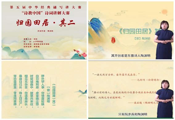 6月21日,“诗教中国”诗词讲解大赛校赛决赛以视频展播方式在人文大楼举办,专业评委对参赛视频作品现场评分,根据成绩确定入围省赛的作品。其中由公共教育学院大学语文教研室主任宋丽娟指导邓钦老师的作品《归园田居·其二》成功入围省赛。