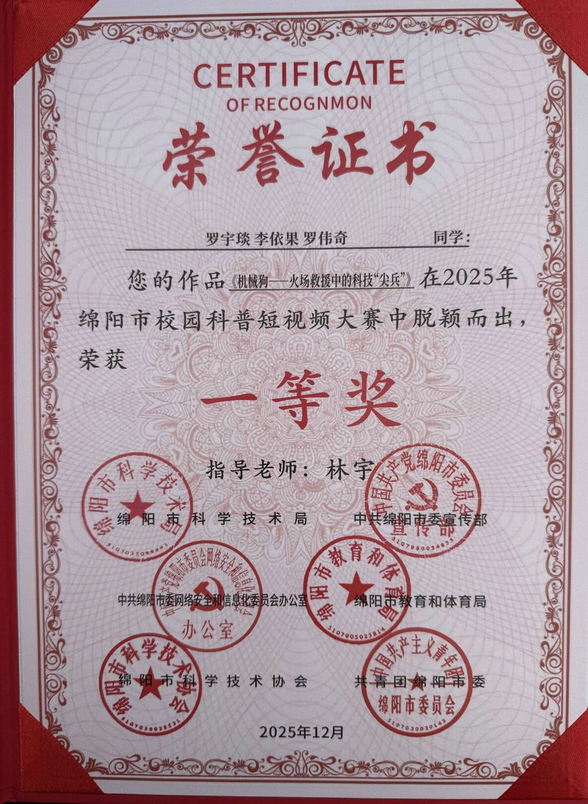 近日,绵阳市校园科普短视频大赛颁奖仪式在绵阳市新闻传媒中心举行。经过多轮激烈角逐,我校人工智能学院学生李依果、罗伟奇、罗宇琰、彭梦玲、赵雅莉的作品《乡村振兴计划:我在乡村当村长》(指导教师:徐莹莹)和人工智能学院学生罗宇琰、李依果、罗伟奇的作品《机械狗——火场救援中的科技“尖兵”》(指导教师:林宇)脱颖而出,均获得一等奖。