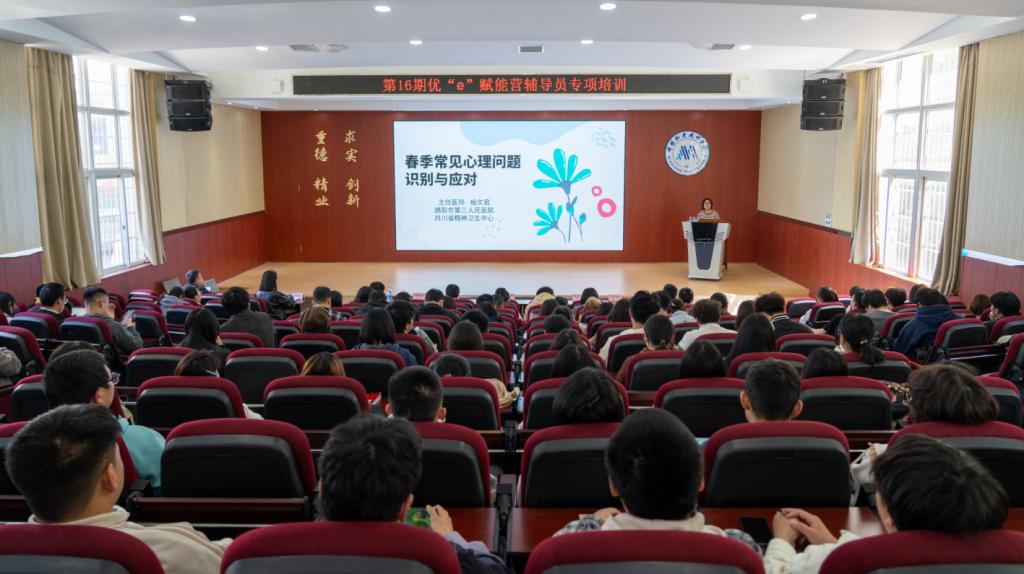 近日,由我校党委学生工作部主办,心理健康教育与咨询中心承办的第16期“优e”赋能营辅导员专项培训在智慧教室举行。本次培训特邀绵阳市第三人民医院心身疾病二科主任医师杨文君作题为《春季常见心理问题识别与应对》专题讲座。学校全体专兼职辅导员和心理委员骨干参加培训。